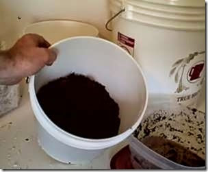 - Đổ bã cà phê vào 1/2 thùng nhựa. Nếu bã cà phê bị khô thì hãy vẩy thêm chút nước vào sao cho vừa đủ ẩm. Tránh không để ứ đọng quá nhiều nước.